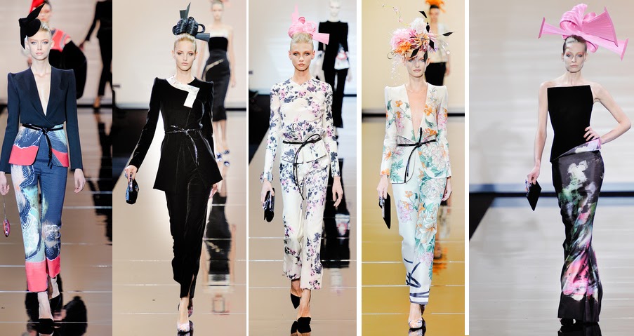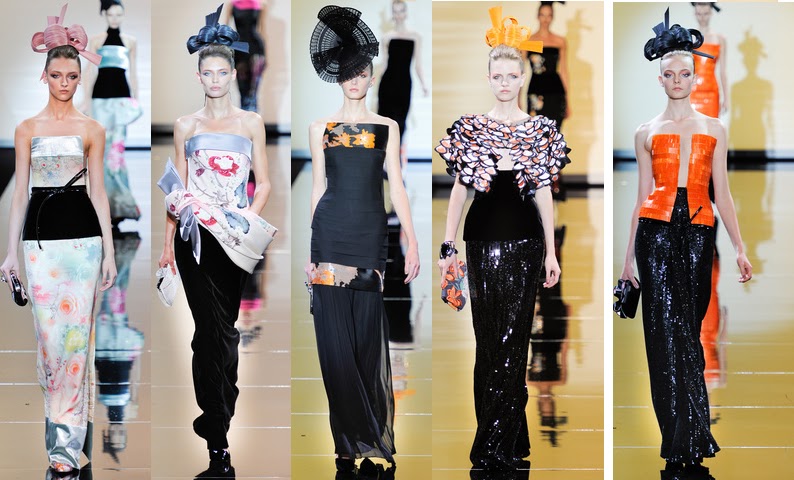 La colección de Armani Privé creada con el negro como telón de fondo, tenía de inspiración a una geisha cosmopolita, que se anima a pasear la ciudad y sus fiestas con una lazada a la cintura. Los estampados orientales, los tocados, un trabajo exquisito…